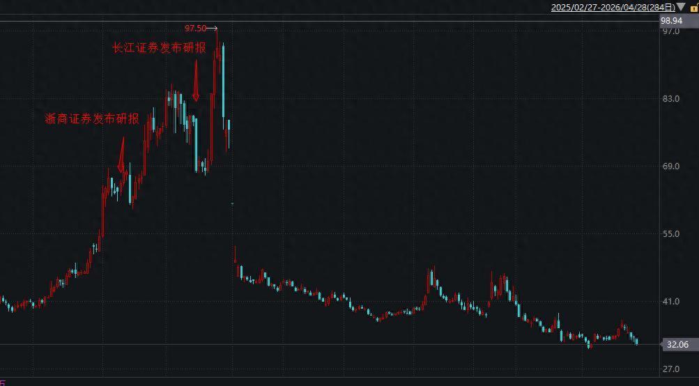 2024年9月至2025年9月的1年间,果麦文化股价最高飞腾高出4倍,于2025年9月24日最高达到97.5元/股(前复权)。尔后,公司股价快速下探,适度2026年4月28日收盘股价已跌至不及35元/股。