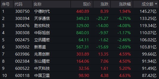 两市个股成交额方面,宁德时间半日成交额超145亿元居首,天孚通讯、胜宏科技、中际旭创、立讯精密、新易盛成交额均超100亿元。
